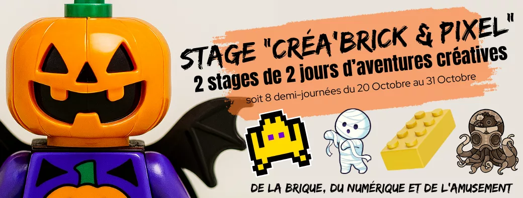 Le stage 2 - Créa’Brick & Pixel - Bouh ! Halloween se déroule sur 2 jours soit 4 demi-journée. Notez bien les dates de celui-ci ci-dessous : Mardi 28 Octobre 9h30 - 12h : Création d’un jeu vidéo sur Scratch avec des monstres rigolos… ou peut-être un peu effrayants, qui sait ! 14h30 - 17h...